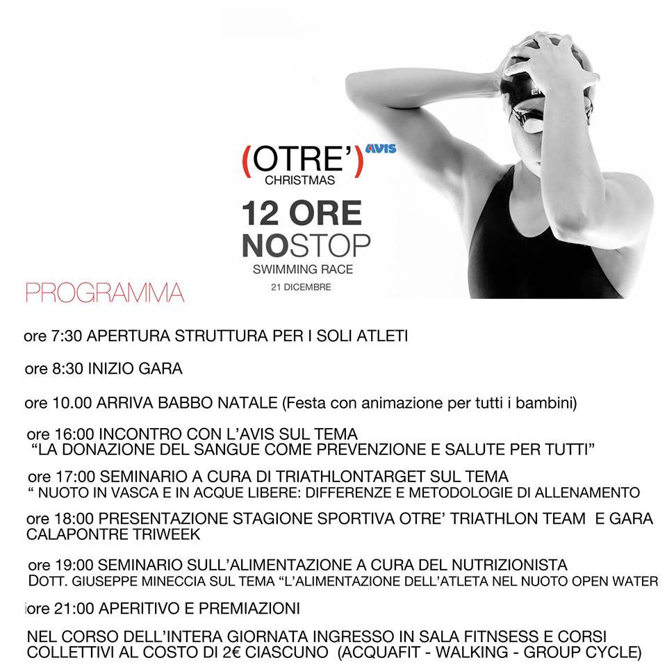 OTRÈ Christmas Swimming Race 12h no stop REGOLAMENTO La società Otrè S.S.D. a r.l. organizza presso il proprio club, domenica 21 dicembre 2014, una manifestazione di solidarietà denominata “OTRÈ Christmas swimming race 12h no stop”. Parte del ricavato sarà devoluto all’associazione AVIS sezione comunale di Noci. La competizione sarà una staffetta a squadre, i cui atleti si avvicenderanno in vasca per 12 ore consecutive; vincerà la squadra che percorrerà la distanza maggiore. Ogni atleta potrà nuotare per un massimo di 90 minuti. Ogni squadra sarà dotata di un rilevatore di distanza. COMPOSIZIONE DELLE SQUADRE Potranno partecipare gli atleti tesserati FIN o FITRI o non tesserati purché in possesso di regolare certificato medico e, comunque, di età superiore ai 16 anni (per i minori dovrà essere compilata una liberatoria da parte di un genitore). Le squadre dovranno essere composte da minimo 12 atleti tra cui eventualmente un solo agonista; potranno partecipare alla stessa compagine anche atleti provenienti da società o sport diversi. ISCRIZIONI Dopo aver compilato il modulo in allegato, le iscrizioni potranno essere inoltrate al seguente indirizzo di posta elettronica: info@o-tre.it La comunicazione di avvenuta iscrizione avverrà tempestivamente. Il numero limite di squadre partecipanti sarà pari a 16. Per la partecipazione all’evento sarà richiesta una quota d’iscrizione minima di € 10,00 ad atleta e, dato il fine della manifestazione, non è prevista la consegna di alcun pacco gara. ORARI Lo start è previsto per le ore 08.30 La manifestazione si concluderà alle ore 20.30 Le premiazioni si svolgeranno alle ore 21.00 PREMI Sarà premiata la squadra vincitrice che in 12 ore avrà percorso la distanza maggiore; inoltre, ad insindacabile giudizio degli organizzatori, sarà anche premiata la squadra con il nome più simpatico. Durante lo svolgimento delle premiazioni, sarà offerto l’aperitivo e si procederà all’estrazione di gadget tra tutti i partecipanti. INFORMAZIONI Nella giornata del 21 dicembre 2014, gli atleti ed i loro accompagnatori potranno accedere all’attrezzatissima sala fitness di cui il club è dotato e/o ai corsi collettivi quali group cycle, zumba, pilates, etc… (previa prenotazione) al modico costo di € 2,00; l’intero ricavato sarà devoluto in beneficenza. Orari e specialità saranno divulgate sul sito web del club o sulla pagina Facebook dedicata all’evento. Per tutta la durata della manifestazione il fornitissimo bar Otrè sarà a disposizione dei partecipanti. Per ulteriori informazioni rivolgersi a: matipetruzzi@gmail.com info@o-tre.it Tutte le Società affiliate F.I.N. e F.I.T.R.I. riceveranno entro le prossime 48ore una mail con il regolamento e il modulo di iscrizione. RICORDATE CHE IL LIMITE MASSIMO DI SQUADRE PARTECIPANTI E’ DI 16!!!!