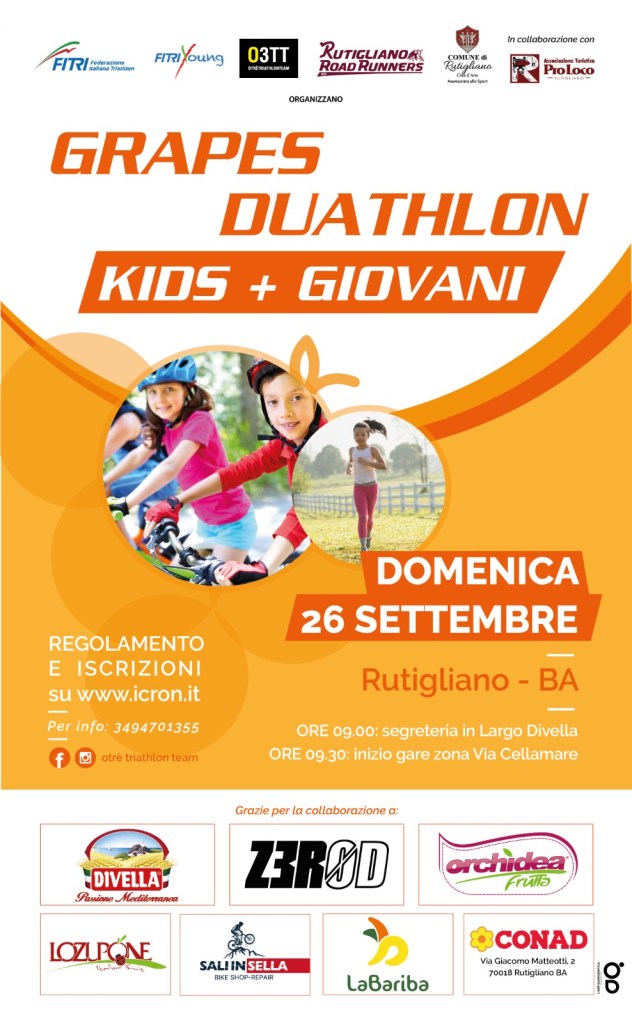 Tutto pronto per la prima edizione del Grapes Duathlon di Rutigliano, manifestazione sportiva nata dalla riuscita collaborazione tra la Rutigliano Road Runners e la Otrè Triathlon Team. Grazie alla programmazione dell’amministrazione comunale per il cartellone estivo rutiglianese (Finestre a sud est – Affacciati a Rutigliano) domenica 26 settembre dalle ore 10, prenderanno il via quattro gare dedicate ai più giovani, dai 6 ai 19 anni. Su varie distanze in base all’età dei partecipanti, gli atleti correranno a piedi un tratto di via Messeni, poi inforcheranno la loro bicicletta per un percorso tracciato su Via Sebastiano Pesce e Via Lia Damato e poi , lasciata la bici, ancora un ultimo tratto a piedi. Il duathlon, una disciplina della Federazione Italiana Triathlon, sbarca a Rutigliano per la prima volta e si apre a chiunque voglia partecipare; l’importante è possedere un certificato medico (non agonistico fino all’età di 11 anni, agonistico dai 12 anni in su), un caschetto omologato ed una bicicletta. Le iscrizioni possono essere richieste presso lo store “Sali in sella” in via Sardegna , da martedì a venerdi. È possibile richiedere ogni informazione al 3494701355. L’appuntamento, invece, per tifare questi ragazzi è domenica 26 dalle 9:30 presso la Pineta Comunale