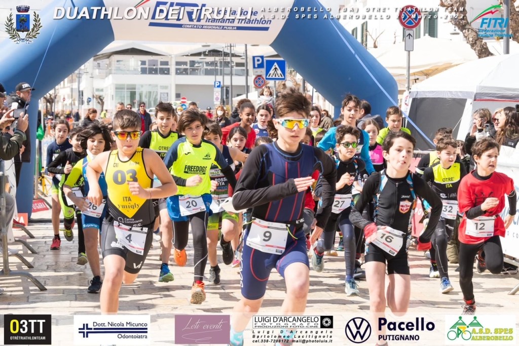 Si torna alle gare targate O3TT, e non in un posto qualunque, ma nella capitale dei trulli, patrimonio dell’UNESCO e sito riconosciuto in tutto il mondo per le sue caratteristiche costruzioni. Quale occasione migliore per inaugurare la stagione della multidisciplina un Puglia, con il Duathlon dei Trulli, prima tappa del circuito di specialità e campionato regionale di società. Duecento iscritti per la gara sprint e circa ottanta per le gare giovanili (numero in costante aumento con una rappresentanza ormai consolidata dei kids della O3TT), tutti assiepati con le proprie biciclette nel centralissimo Largo Martellotta. Inaugurano le gare i giovani della categoria Youth A (14/15 anni) con un giro di corsa nell’aia piccola (1,2 km), un giro da 5 km in bicicletta sulla direttrice che porta a Barsento e, per finire, un altro giro di corsa fino a tagliare il traguardo in Largo Trevisani. Vincono, in circa venti minuti, Lupo Passaseo (Nest Lecce) e Giorgia Abbatantuono (Netium Giovinazzo). E’ dunque la volta dei più grandi, raccolti in tre batterie, modalità che fino alla fine lascia tutti con il fiato in sospeso per decretare il vincitore finale, dopo aver fatto i conti con il minuto che separa le diverse partenze. Il circuito multilap, poi, rende avvincente anche per i tanti spettatori assistere alla rincorsa dei vari pretendenti e permette di supportare i propri atleti, vedendoli sfrecciare più volte nelle tortuose strade cittadine. Per cinque secondi, ha la meglio al traguardo il sempre verde Vito Perta (Triathlon Valle D’Itria); tra le donne invece, ancora un’atleta della Nest, Maia Passaseo, giovane sempre più protagonista nel panorama pugliese. Finita la gara sprint, valevole anche per l’assegnazione dei punti ranking nazionali, tutti a tifare nelle ultime due competizioni della giornata per i piccoli kids (6/9 anni) e per i giovanissimi (10/13 anni) numerosi e coloratissimi, su distanze inferiori a loro congeniali. Tutti gli applausi sono stati per loro, determinati e competitivi come i loro colleghi più grandi, a tagliare lo stesso traguardo sotto gli occhi emozionati di genitori ed allenatori. Medaglia al collo per tutti, e menzione ai vincitori dell’unica categoria agonistica (ragazzi) con Alessandro Antonacci (O3TT) e Luce Passaseo (Nest). Festa finale con il presidente del Comitato Regionale Fitri, Antonio Tondi, ed i padroni di casa Sindaco Michele Longo e Assessora allo Sport Antonella Ivone, con la conduzione attenta e competente di Michele Cuoco. Un esperimento ben riuscito, quindi, l’organizzazione O3TT-Spes Alberobello, che ha generato una gara di gran livello, che ha mostrato molti margini di miglioramento per ambire anche a titoli più importanti per una location unica al mondo.