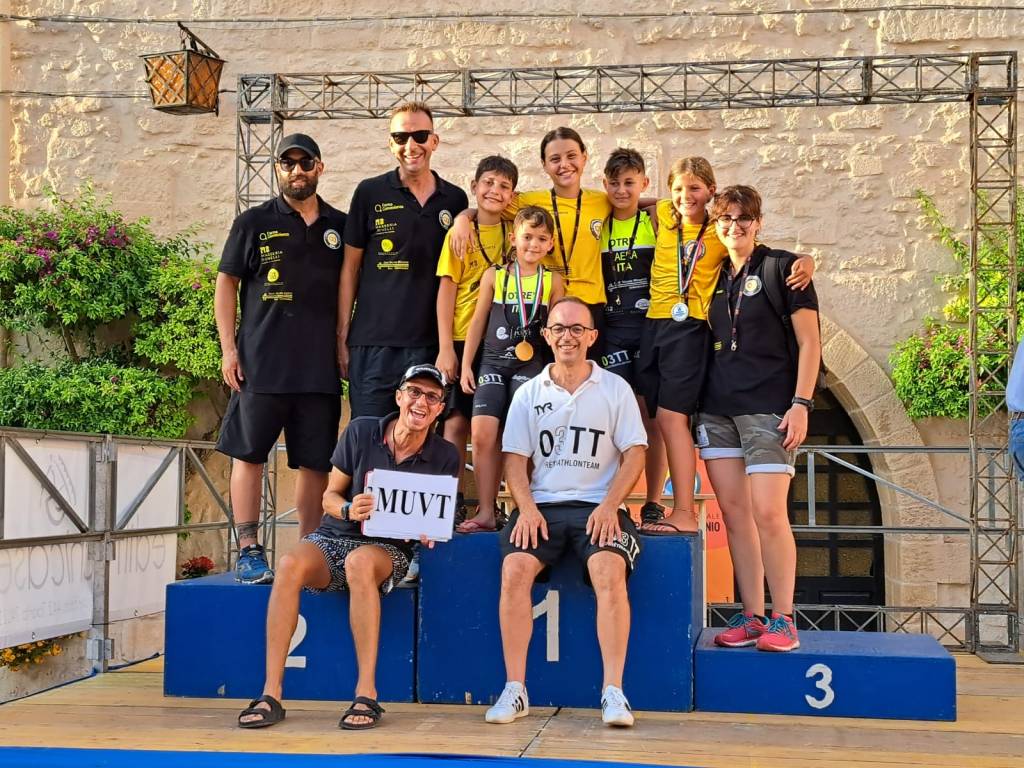 Il prologo alla gara più importante, l’hanno fatto al sabato le gare giovanili. Anche per loro, la sfida da affrontare è stata l’Aquathlon con le rispettive distanze di 50m a nuoto e 200 di corsa per i Mini Cuccioli e Cuccioli; aquathlon completo per i più grandi della categoria Esordienti e Ragazzi con 750m di corsa / 250m a nuoto / 750m di corsa. Gara ideale, mare calmo a 28ºC , il percorso Run senza falsi piani, ha dato la possibilità agli atleti di potersi esprimere al massimo delle loro potenzialità. Bravissimi i Mini Cuccioli e Cuccioli, che terminata la frazione nuoto, si sono cimentati in una corsa verso la zona cambio degna del triatleta più navigato. Arrivato il momento dei più grandi, con le distanze delle frazioni classiche della gara, spettacolari gli ingressi in acqua dalla banchina, dove gli atleti senza perdere tempo si sono lanciati letteralmente in mare!!! I nostri atleti hanno dato prova di grande caparbietà, nonostante la giovane età e le ancora poche gare fatte, hanno superato limiti personali e sconfitto paure, dando prova di una grande crescita personale. I piccoli otrini presenti a Taranto: Lovecchio Lucilla, che si porta a casa una bella medaglia di Bronzo, D’Onghia Nicole che conquista un meritatissimo Argento, Laera Pasquale medagliato con l’Oro. Seguono i più grandi categoria ragazzi, con Boccardi Eleonora, Laera Pietro, Scagliarini Alessandro.